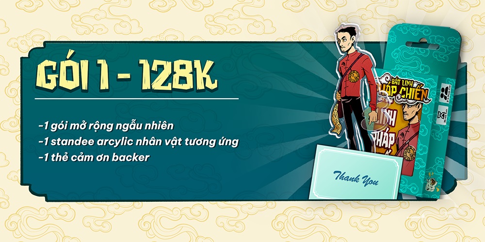 1 gói mở rộng ngẫu nhiên + 1 standee arcylic nhân vật tương ứng + 1 thẻ cảm ơn backer | Giá bán lẻ dự kiến: 188k